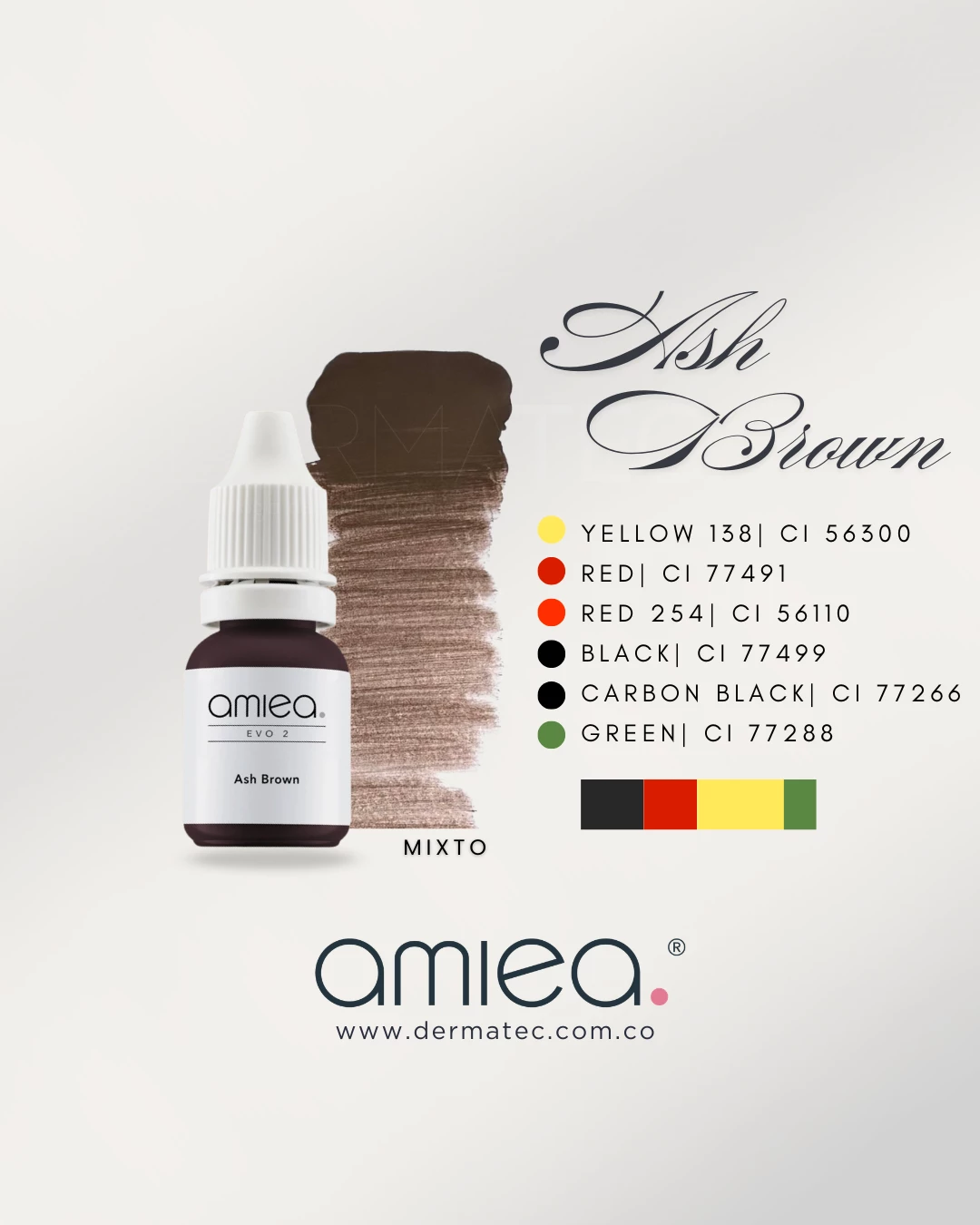 Pigmento de alta calidad para Cejas tono ASH BROWN linea Evo2, marron medio neutro/frío con formulación mixta, compuesto por pigmentos organicos e inorganicos logrando mayor estabilidad.